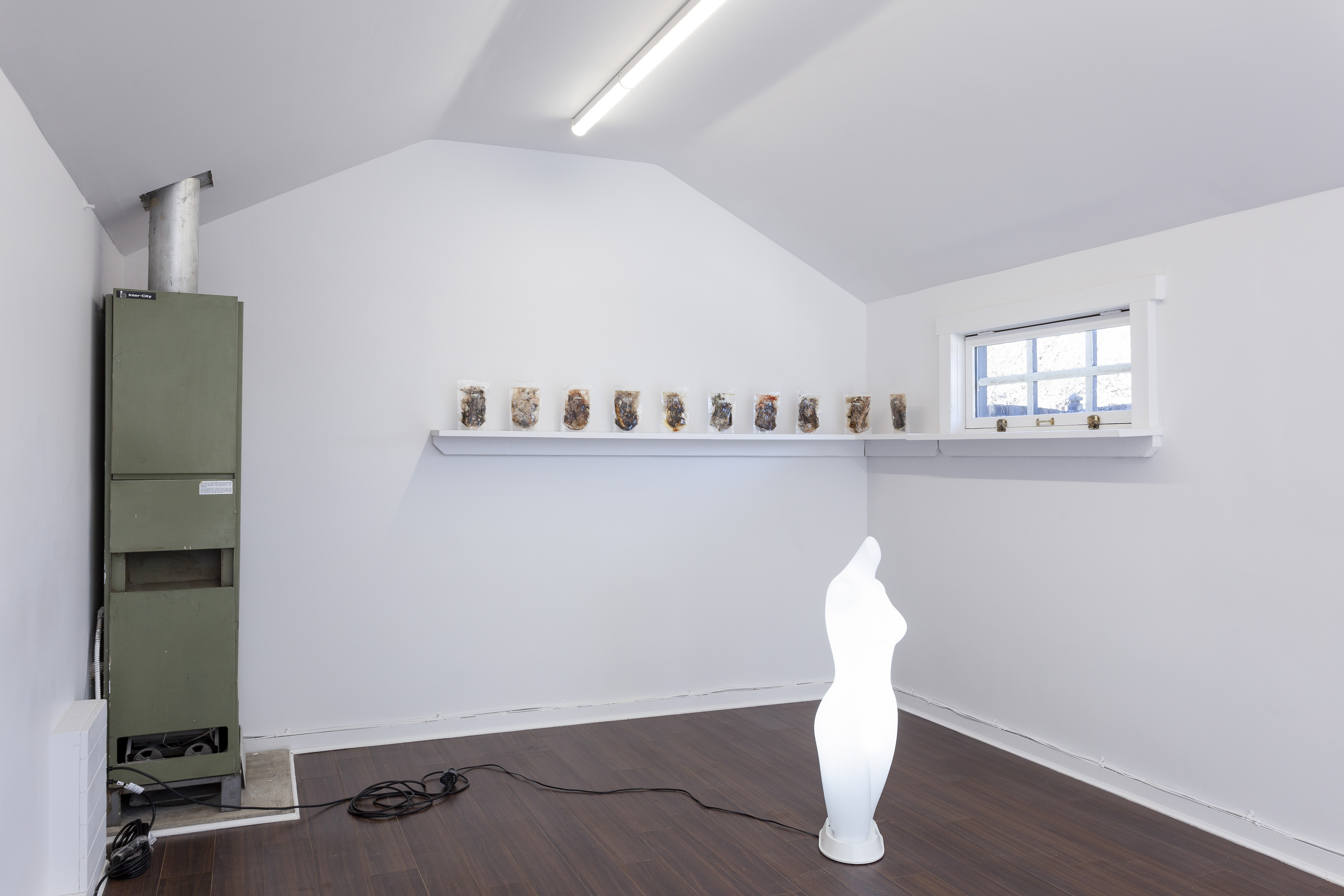 Breastfeeding (installation view)Inkjet prints on rice paper, make-up foundation, yeast, water, vinyl, spigot, tube, bottle caps, air-dry clay, plaster bust of Venus de Milo.
