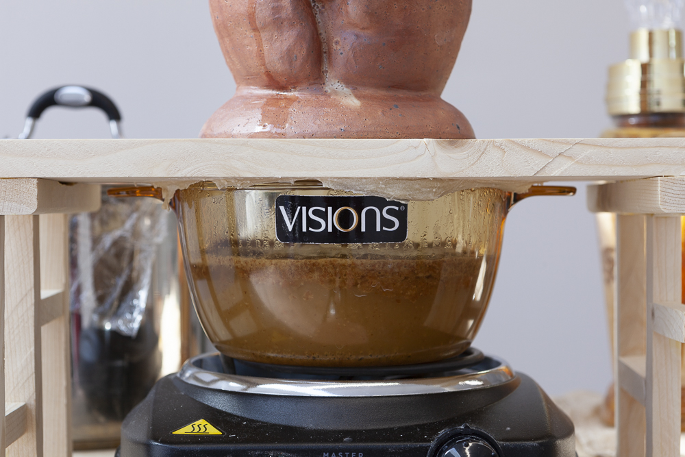 Ceramic distiller, glass pot, electronic stove, fermented rice liquid, cooling pack, water, so-ju, ceramic Venus figurines, yeast, shot glasses, gel wax, perfume bottle, mulberry, arrowroot, hemp cloth, ocher powder, tomato powder, gel wax, jojoba oil, plastic, make-up foundation, moisturizing cream, air-dry clay, sculpey, funnel, glass jug, wood, inkjet prints on rice paper.